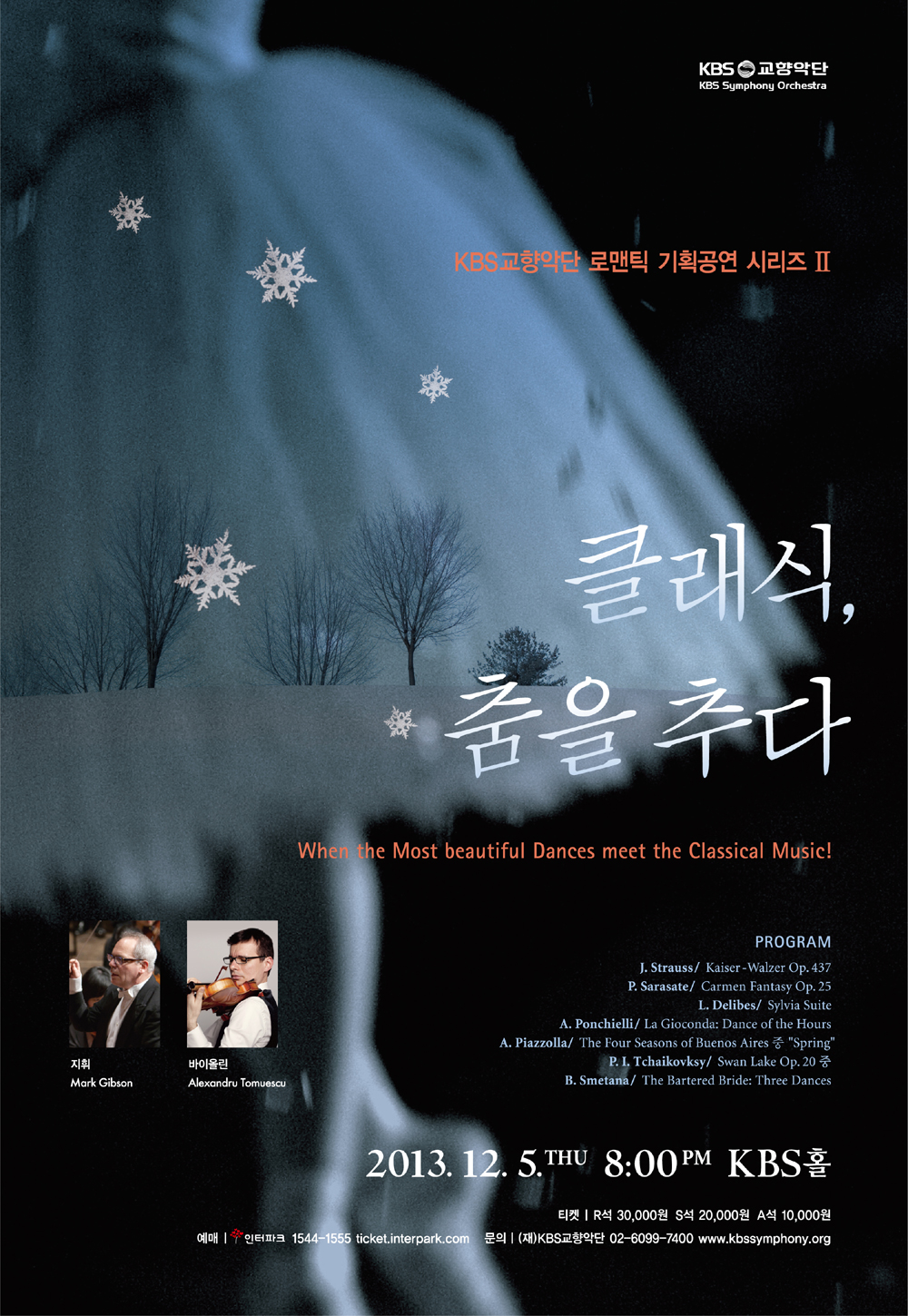 아름다움의 상징 발레, 정열의 춤 탱고, 우아한 왈츠... 춤의 종류는 다양하다. 이 춤들과 함께 빠질 수 없는 것이 바로 음악이다. 작곡가들은 춤을 위하여 음악을 쓰기도 하고, 또 어떠한 음악에 영감을 받아 춤을 만들기도 한다. 이렇듯 음악과 춤은 서로 얽히고 어우러져 하나의 작품을 탄생해 낸다. KBS교향악단 로맨틱 기획공연 시리즈 2탄은 “춤”과 “음악”이다. 관객들에게 너무나도 잘 알려진 크리스마스의 대표작품 차이콥스키 호두까기를 비롯하여 슈트라우스의 왈츠, 사라사테의 카르멘 환타지 등 다양한 장르의 춤과 음악을 선사한다. 이번 연주의 지휘를 맡은 Mark Gibson은 현재 루카 오페라극장과 음악 페스티벌의 예술감독으로 프로그램의 기획단계에서부터 참여하여 그의 풍부한 경험을 마음껏 발휘하였다. 특히 바이올린 협연으로 참여하는 루마니아 출신 Alexander Tomescu는 유럽 지역에서 활발히 활동하고 있는 젊은 연주자로 화려한 테크닉과 열정적인 무대는 관객들의 마음을 사로잡을 것이다. “클래식, 춤을 추다”는 12월 크리스마스와 연말연시를 맞이하여 연인과 가족들이 함께 관람할 수 있는 최고의 선물이 될 것이다.
